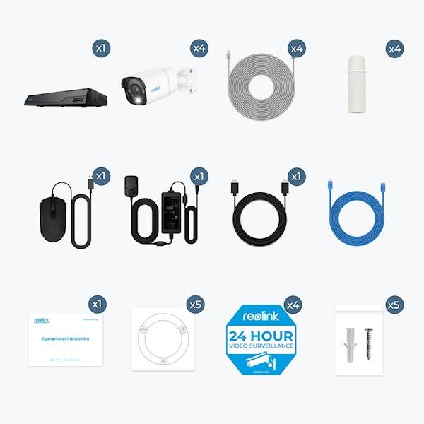 Set v pakiranju vključuje 4 kamere P340, 1 snemalno enoto NVS8-12MB4, ter vse potrebne dodatke in kable za hitro namestitev. Na snemalno enoto lahko priklopite do 8 kamer Reolink.