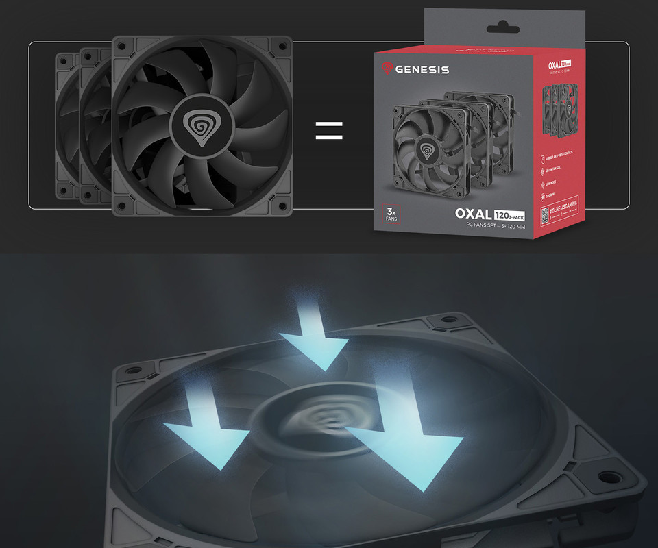 Genesis Oxal 120 je ventilator z optimizirano nizko hitrostjo delovanja, ki kljub temu zagotavlja zmogljivost, primerljivo z ventilatorji s hitrostjo okoli 1400 vrtljajev na minuto – vendar pri bistveno nižjih vrtljajih. To pomeni učinkovito hlajenje ob občutno tišjem delovanju.