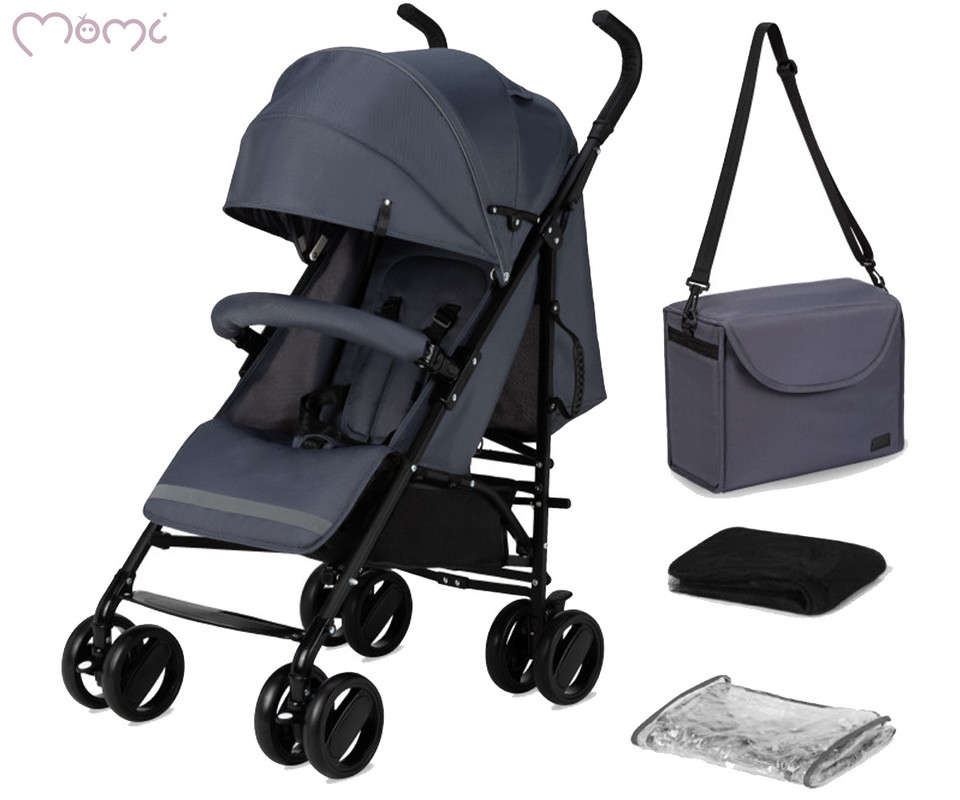 MoMi AKIRA otroški voziček, zložljiv, nastavljiv, streha z oknom, 5-točkovni varnostni pas, košara, torba, trpežna EVA kolesa, nožna zavora, +dodatki, 102.5x80x51cm, sivo-črn
