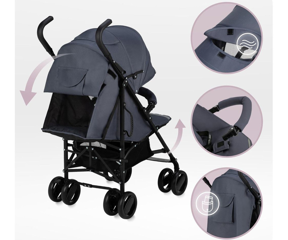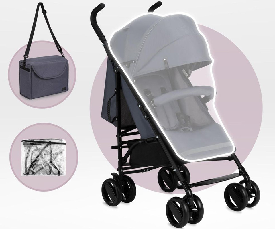 Voziček je tudi praktičen – vključuje prostorno nakupovalno košaro, zadnji žep za drobnarije ter uporabne dodatke, kot so torba, dežna prevleka in mreža proti komarjem.