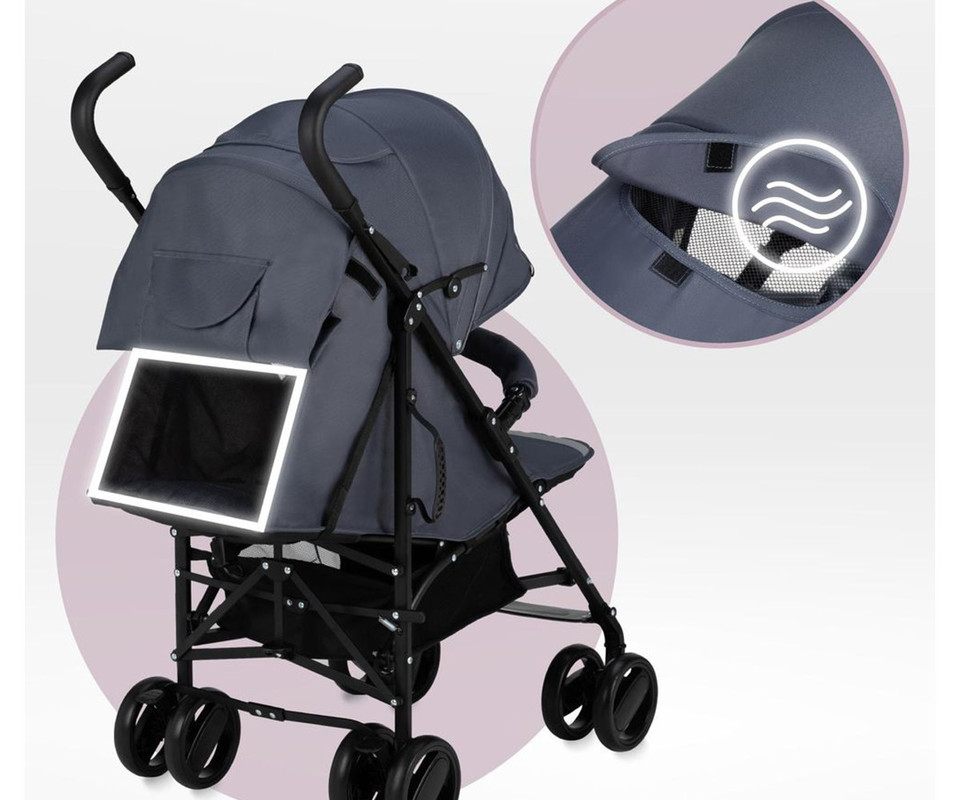 • Velika strešica z okencem – učinkovito ščiti pred soncem, vetrom ali rahlim dežjem, hkrati pa ti okence omogoča, da imaš otroka ves čas na očeh brez ustavljanja.
