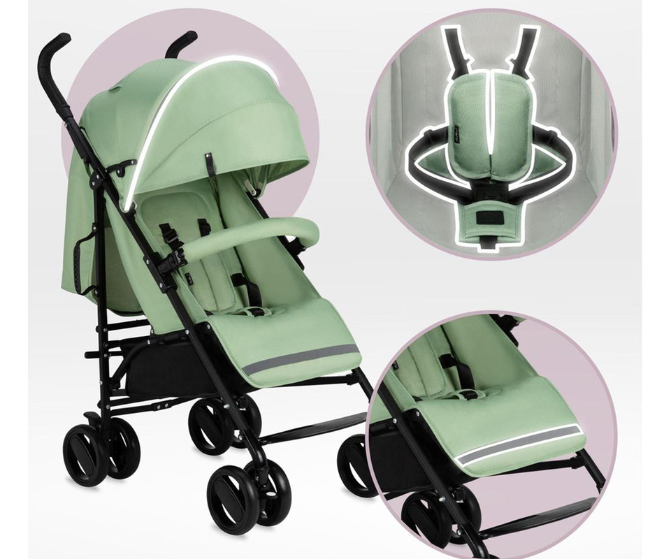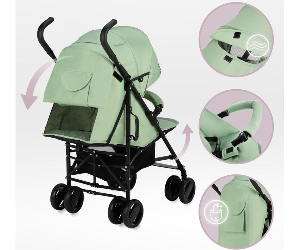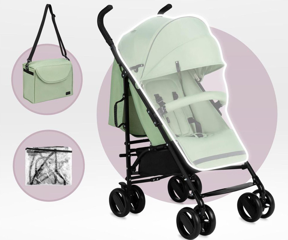 Voziček je tudi praktičen – vključuje prostorno nakupovalno košaro, zadnji žep za drobnarije ter uporabne dodatke, kot so torba, dežna prevleka in mreža proti komarjem.