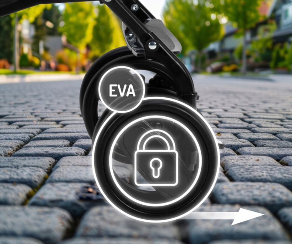- EVA kolesa (neprebojna) – kolesa so odporna na predrtje in ne zahtevajo vzdrževanja kot napihljiva. Sprednja kolesa se lahko zaklenejo za bolj stabilno vožnjo po neravnem terenu ali pustijo vrtljiva za lažje manevriranje v mestu.