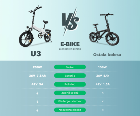Električno kolo U3 je idealno za vsako potovanje! Z zložljivim okvirjem in priročnim nastavljivim krmilom prekaša druga kolesa. Uživajte v udobnem potovanju z vzmetenjem sprednjih koles in oblazinjenim sedežem. Kolo se lahko pohvali tudi z zadnjim blatnikom in udobnim sovoznikovim sedežem, ki zagotavlja čisto in suho vožnjo tako za kolesarja kot za sopotnika.