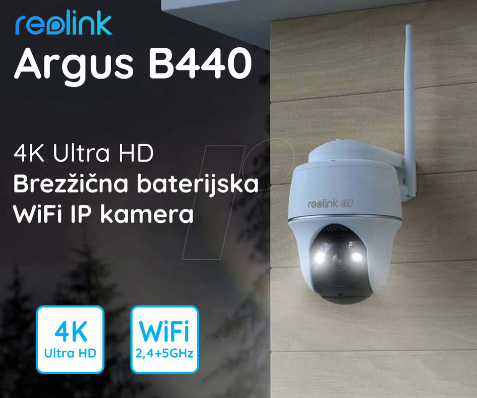 Kamera Reolink Argus B440 je zasnovana za zagotavljanje varnosti za vaš dom. Z ločljivostjo 4K Ultra HD snema video z večjo jasnostjo, zahvaljujoč IR LED lučem pa vas zajema jasne podrobnosti tudi ponoči. Dodatno je nameščena tehnologija za zaznavanje gibanja / oseb / vozil / živali. Funkcija 355° vrtenja in 140° nagibanja vam omogoča ultra širok pogled, ki pokriva vsak kotiček, vgrajena pa sta tudi zvočnik in mikrofon za enostavno dvosmerno komunikacijo. Druge funkcije, ki jih ponuja Argus B440: 100% brezžično delovanje, polnilna baterija, ter shranjevanje posnetkov na micro SD kartico do velikosti 128 GB.