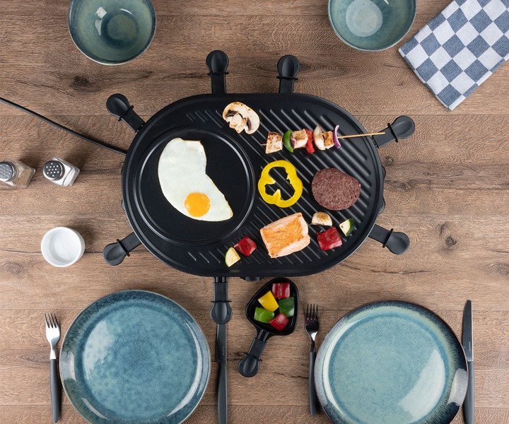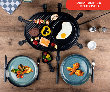 Raclette za 8 oseb - ta komplet vsebuje set za raclette z rešetko in 8 ponvic ter 8 lopatic, tako da lahko v obroku uživa tudi večja družba.