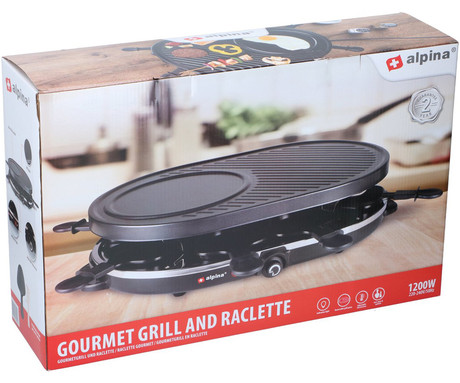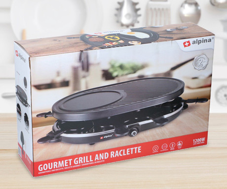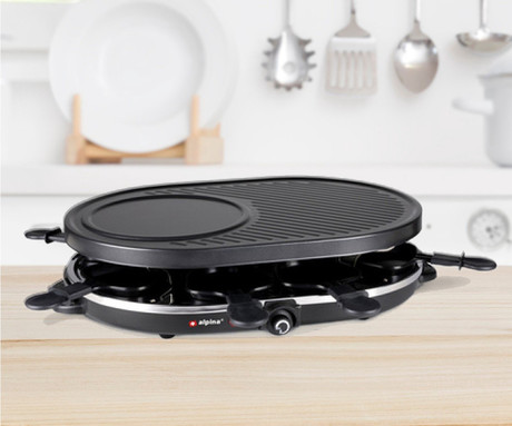 ALPINA GRILL električni žar / raclette, gourmet, 1200W, gladka + rebrasta plošča, 8x ponev + 8x lopatka, ovalen, do 8 oseb, črn