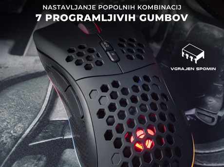 7 nastavljivih in programljivih gumbov prilagodite povsem vašim potrebam, določite jim različne funkcije in makre ter uživajte v bliskovito hitrih odzivih. Z možnostjo programiranja funkcij pridobite popoln nadzor nad miško.