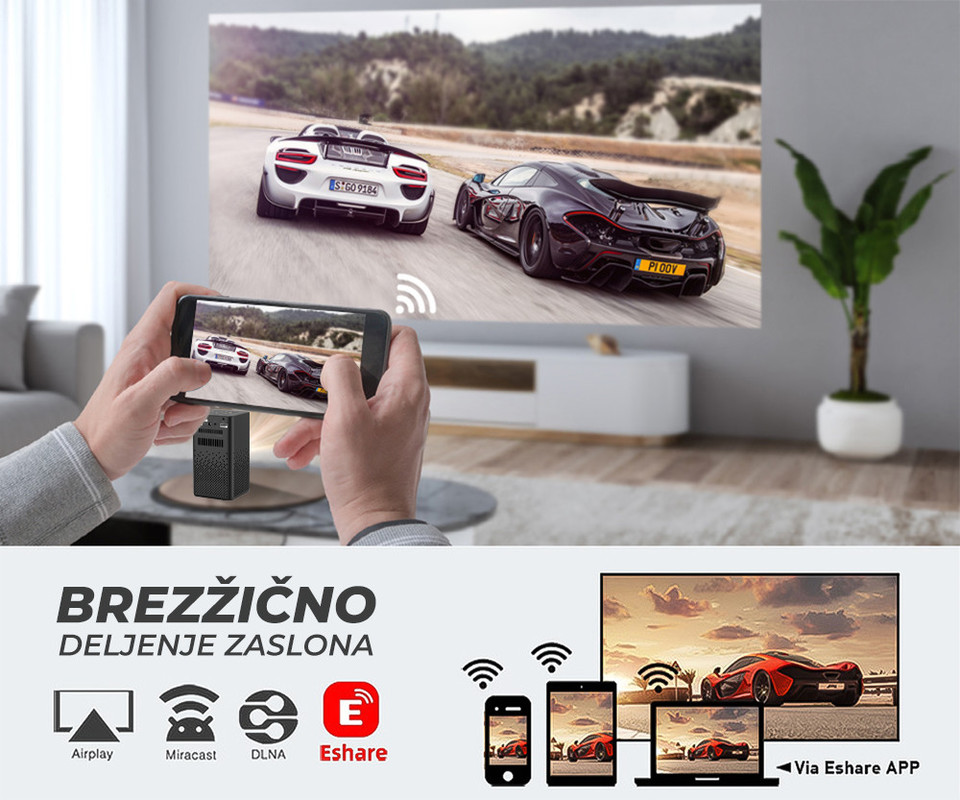 • WiFi & Bluetooth - Zahvaljujoč dvopasovnemu WiFi povezovanju in vgrajeni Bluetooth povezavi, lahko uporabljate internet in projektor povezujete z ostalimi zunanjimi pametnimi napravami.