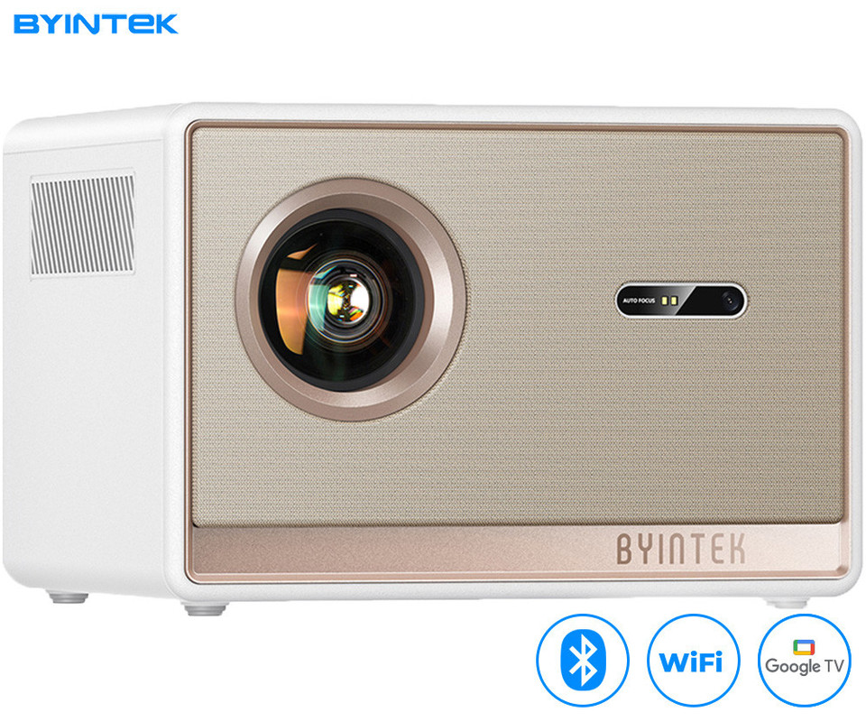 BYINTEK PLATO T5 MAX prenosni LED projektor, GoogleTV, WIFI 6, Bluetooth, 1000 ANSI lumnov, STEREO zvočniki, samodejni fokus, deljenje zaslona, max 4K UHD, USB / HDMI / AUX / RJ-45, +daljinec, bel