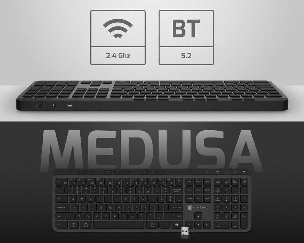 Natec Medusa je tipkovnica, zasnovana za uporabnike, ki pričakujejo več kot le osnovno funkcionalnost. Zaradi elegantne zasnove, večopravilnosti in brezžične povezljivosti, ter svobode povezovanja in združevanja naprav je popolna tako za pisarno kot za dom.