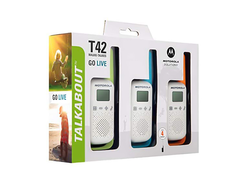 Komplet treh Motorola T42 Walkie Talkie-jev je odličen pripomoček za zabavo ali v praktične namene. Primerna je za vse vrste zunanjih športov (smučanje, kolesarjenje, jezdenje, tek, pohodništvo, kampiranje,...), za različna delovna mesta ter tudi za domačo uporabo.