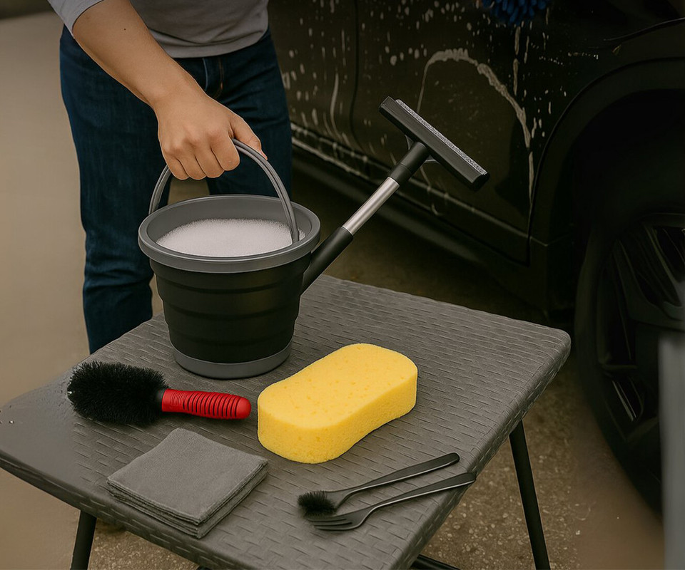 Ta komplet avtomobilske opreme ni le popoln, ampak tudi zelo priročen. Zložljivo vedro se enostavno prilega v prtljažnik, lahki materiali pa omogočajo, da ga vzamete s seboj kamor koli. Popolno za na pot ali na počitnice!