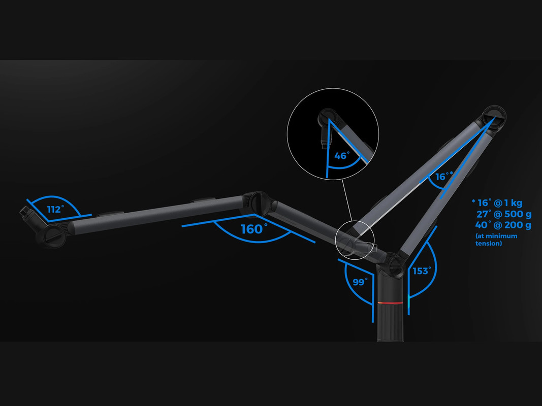 Omogoča veliko fleksibilnost glede kotov upogibanja in s tem lažje prilagajanje položaja mikrofona v primerjavi z drugimi rokami na trgu. Spodnji del roke se lahko upogne nazaj za največ 152°, hkrati pa med njim in zgornjim delom ohranja kot 55,5°. Ta funkcija je izjemno uporabna za igralce iger, streamerje in ustvarjalce vsebin, saj omogoča, da se dodatek namesti blizu obraza, hkrati pa roka ostane na želenem mestu v snemalnem kadru. Največji koti upogibanja so prikazani na grafiki – velja omeniti, da se lahko nekoliko razlikujejo glede na nastavljeno napetost.