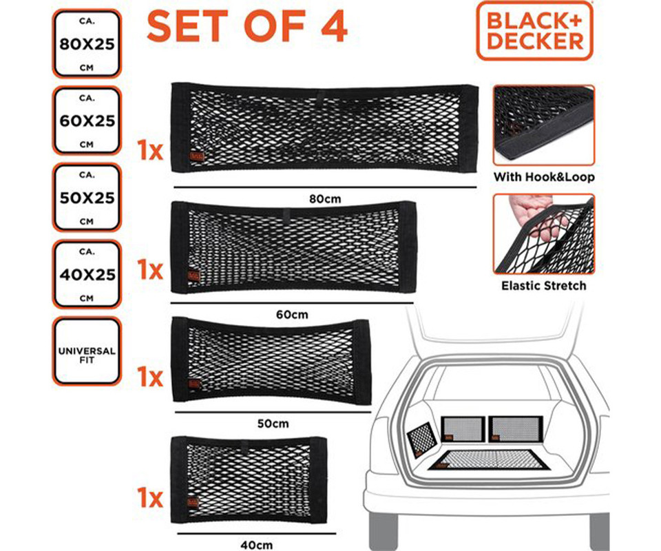 Komplet vsebuje štiri mreže različnih velikosti, s katerimi lahko organizirate prostor v prtljažniku in preprečite premikanje predmetov med vožnjo. Namenjene so shranjevanju prtljage, nakupovalnih vrečk, športne opreme ali manjših predmetov, ki bi sicer potovali po vozilu.