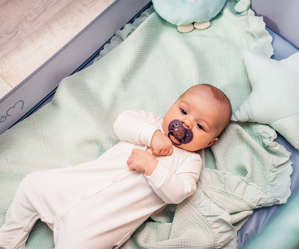 Stranske stene potovalne posteljice so narejene iz trpežne mrežaste tkanine, ki zagotavlja pravilno kroženje zraka. Poleg tega bo otrok po prebujanju lahko videl svojo mamo.