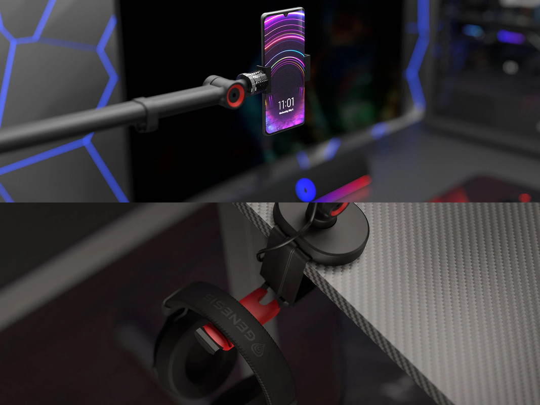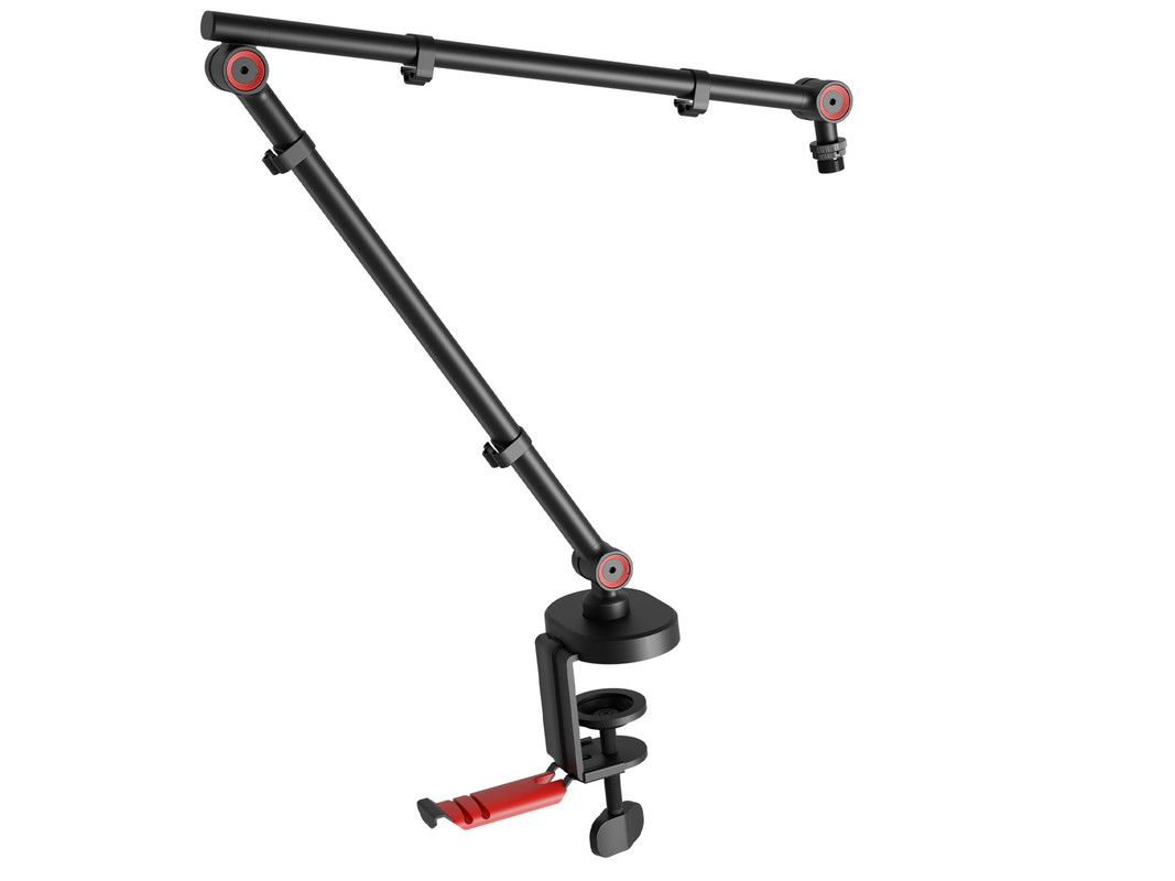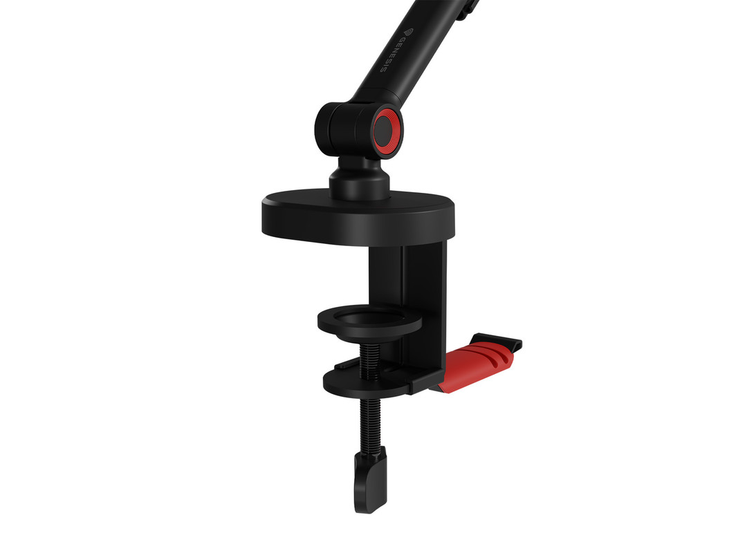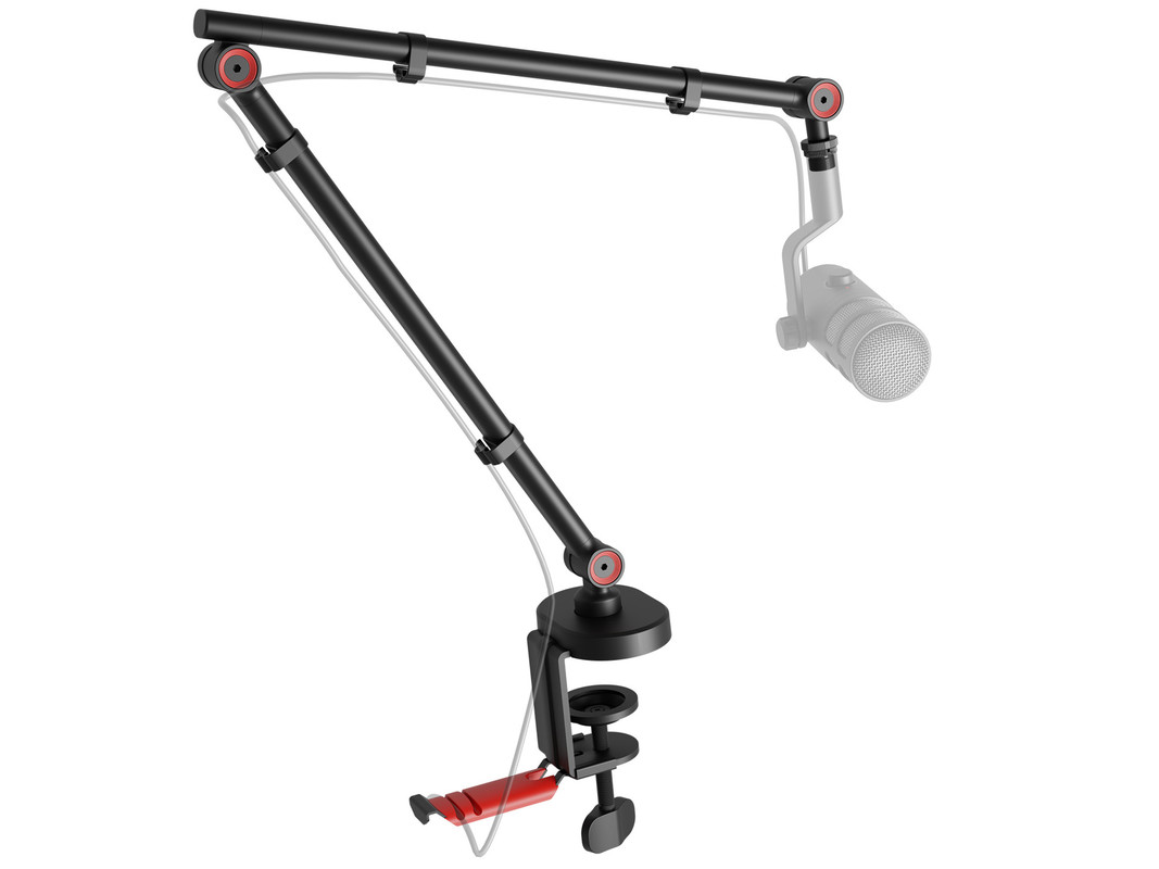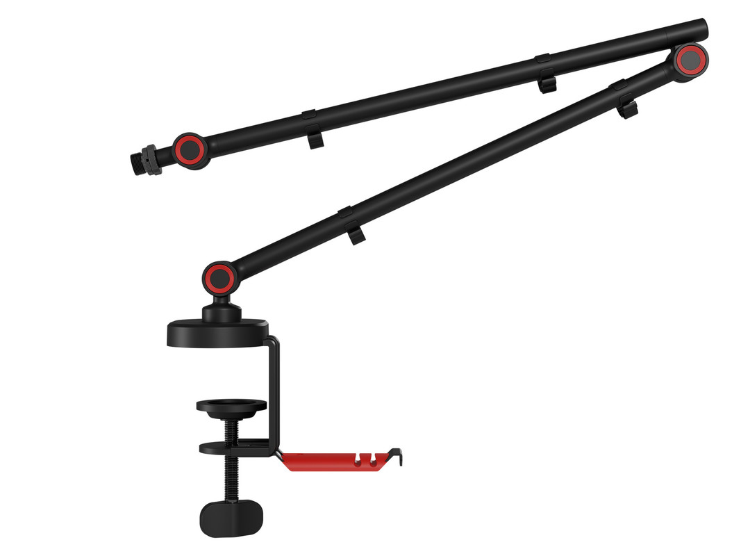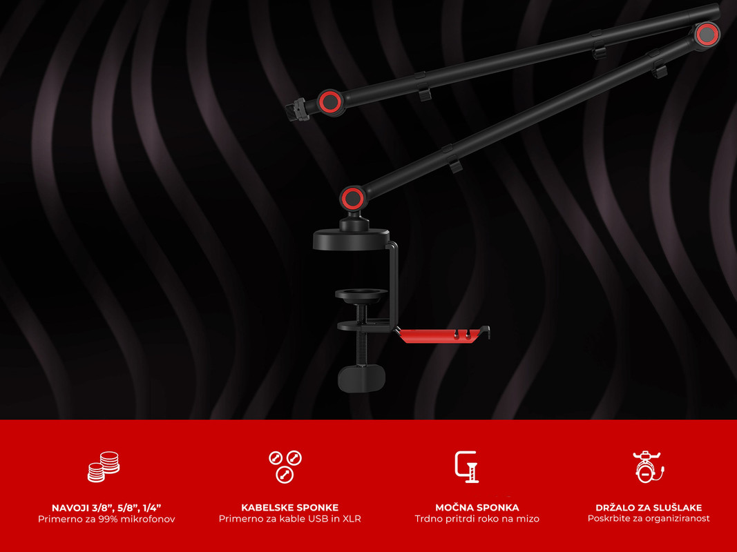 Držalo, pritrjeno na podnožje ročice z dvema vijakoma, ki zagotavljata popolno stabilnost, nudi namensko mesto za vaše slušalke, ki jim ni več treba zavzemati prostora na mizi ali policah. Nosilec ima dodatno 2 utora za kable, ki omogočata hkratno napeljavo kablov mikrofona in slušalk. Nastavljiva črna roka mikrofona z rdečimi poudarki in držalom za slušalke, zasnovana za optimalno pozicioniranje in udobje.